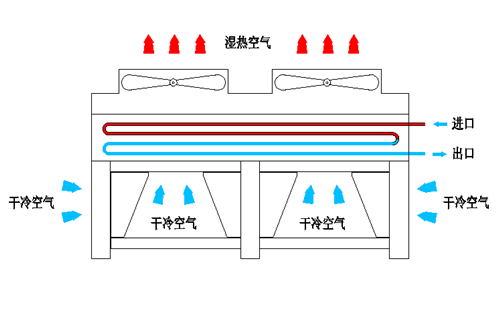 Dry cooling tower uses the power to drive the fan impeller to rotate, and the generated eddy current continuously sucks the air. After the cold air contacts with the heat exchange tube, it transfers heat and cools the medium in the tube to reach the designed outlet temperature.